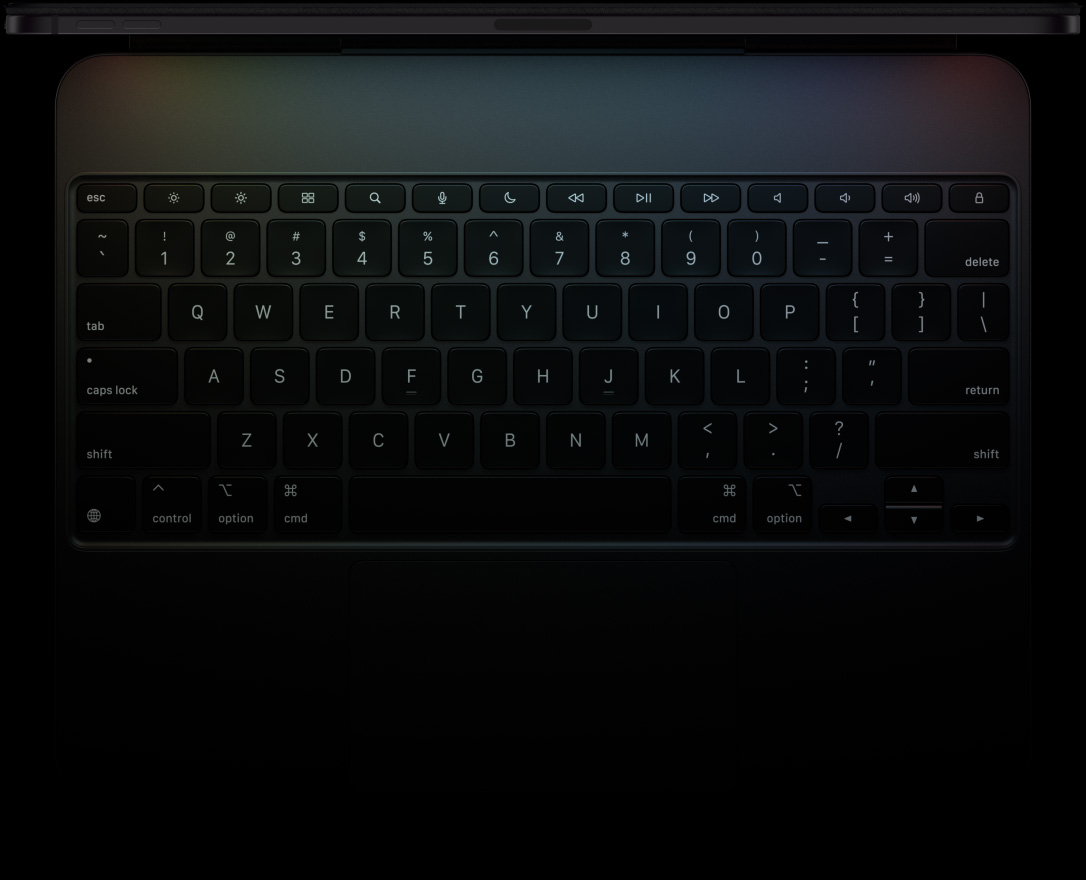 Magic Keyboard delivers an amazing typing and trackpad experience in a sleek, portable design with an aluminum palm rest.12 The keyboard includes a function row and a large glass trackpad with haptic feedback for precise work and Multi‑Touch gestures.