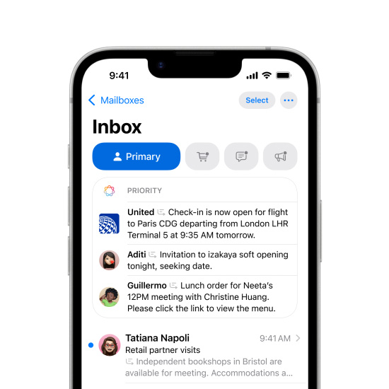 Priority messages in Mail elevate time-sensitive messages to the top of your inbox — like an invitation that has a deadline today or a check-in reminder for your flight this afternoon.